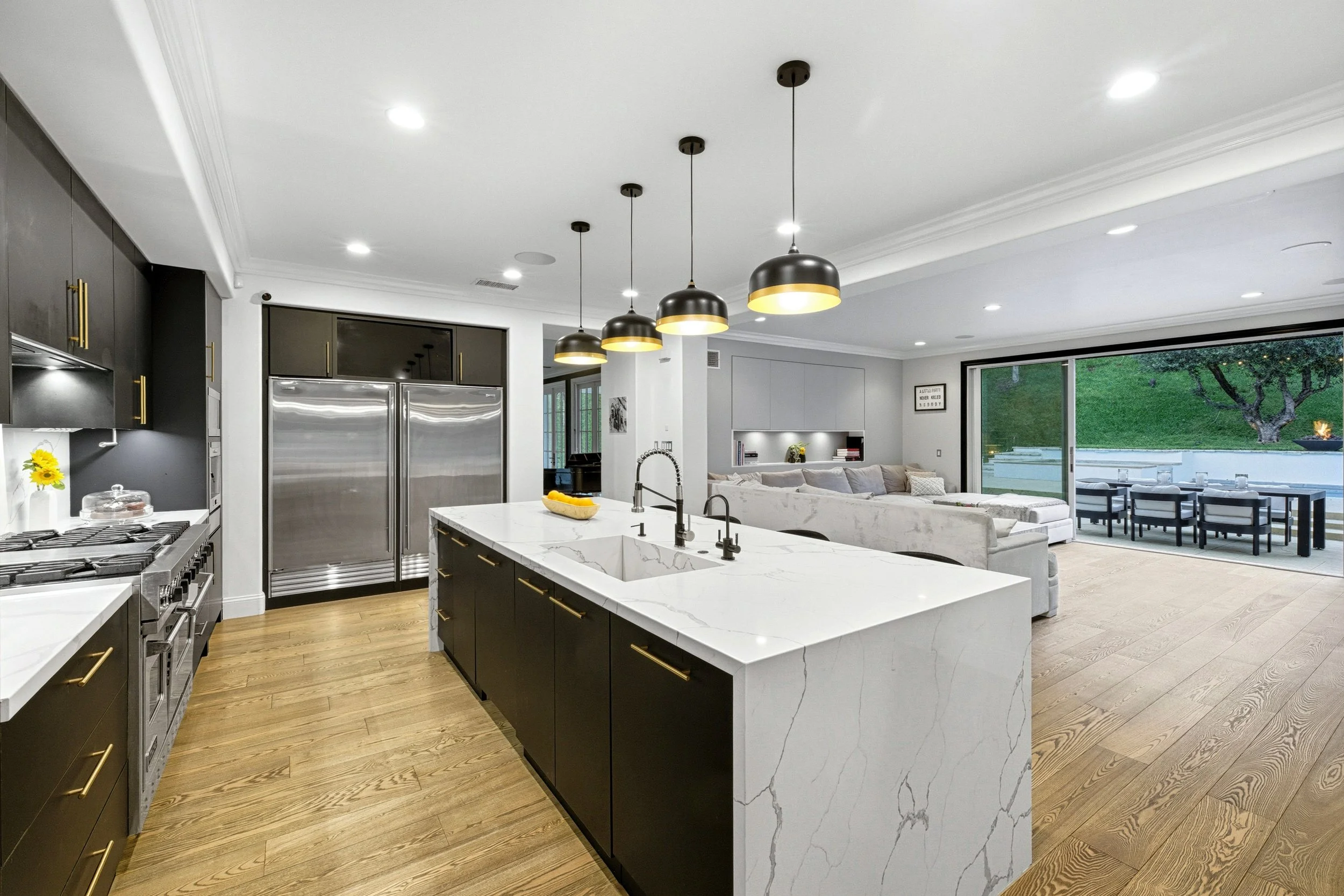Located in the exclusive guard-gated community of The Oaks of Calabasas, this modern organic designer estate embodies contemporary elegance with a seamless connection to nature. The entry is an architectural statement, with a custom-built glass door, glass staircase, natural stone wall and a porcelain slab wall with custom LED lighting. Natural light fills the formal living and dining rooms through expansive glass doors that blur the line between indoors and outdoors.