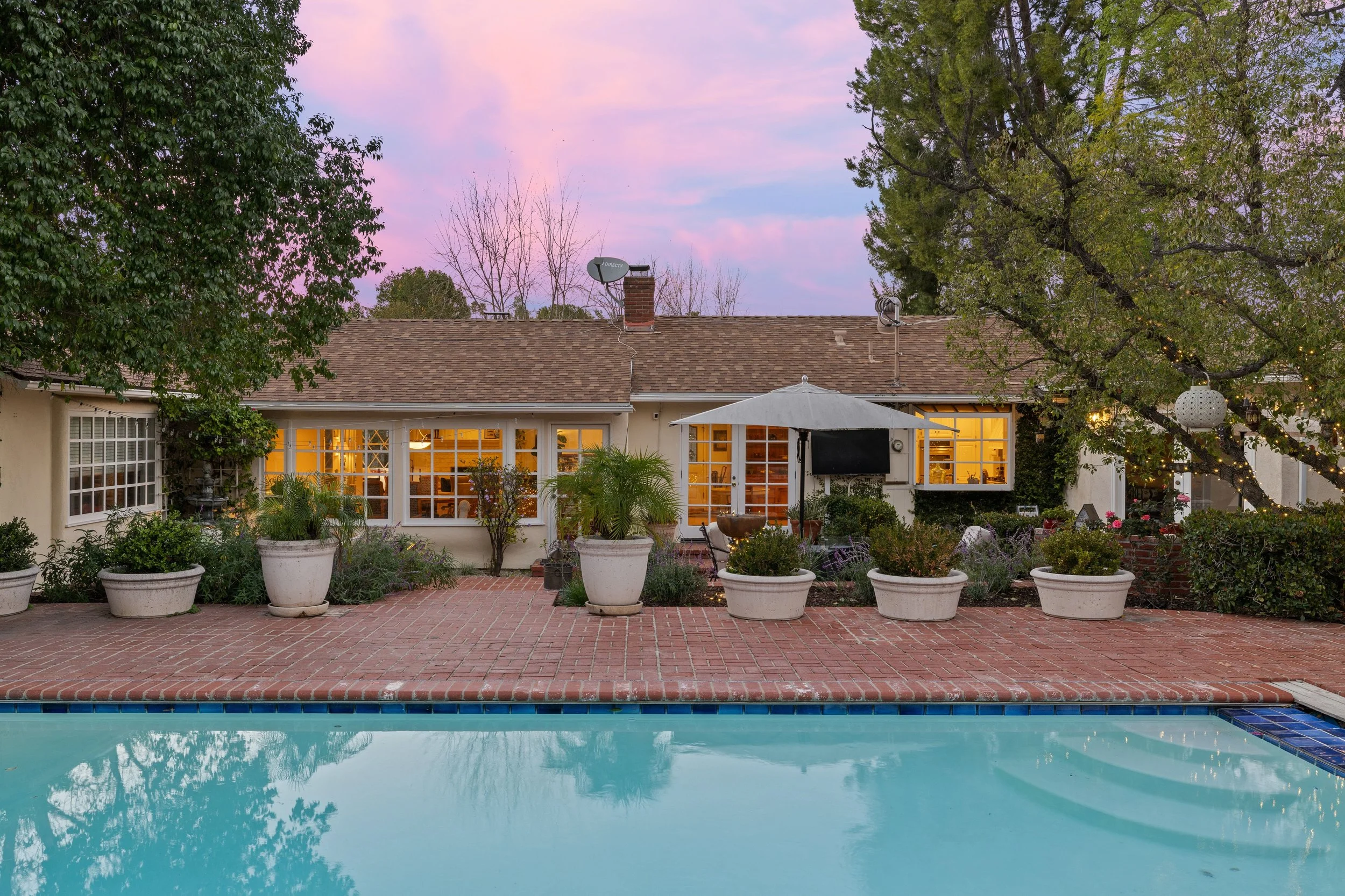 A single-story ranch set on over 19,000 square feet of flat, private land the kind of lot that is increasingly rare in the western San Fernando Valley. The formal living room features a second fireplace, diamond-pane windows, and built-in shelving. A generous dining room wrapped in windows completes the main living areas. The primary suite is privately situated at the rear of the home with vaulted ceilings and an en suite bath. Three additional bedrooms are thoughtfully arranged on opposite wings of the home, served by two full bathrooms a layout that offers natural separation and privacy for family members or guests. The detached pool house with French doors and its own fountain courtyard offers flexible space for guests, extended family, or a home office. An outdoor shower just outside adds to the resort feel. The expansive flat lot provides ample room to expand the existing pool house or add additional structures flexibility that simply doesn’t exist on the smaller lots typical of newer developments. Hardwood floors run throughout. Three apple trees, a fig, and an apricot grow on the grounds. The newly plastered pool and a new roof offer peace of mind from day one. A spacious side driveway on the left provides room for an RV or extra vehicles, while a dedicated dog run along the right side adds a practical touch for pet owners. Mature trees and the expansive flat lot create a backyard that feels private, peaceful, and enduring a rare combination of land, character, and setting in one of Woodland Hills’ most desirable pockets.